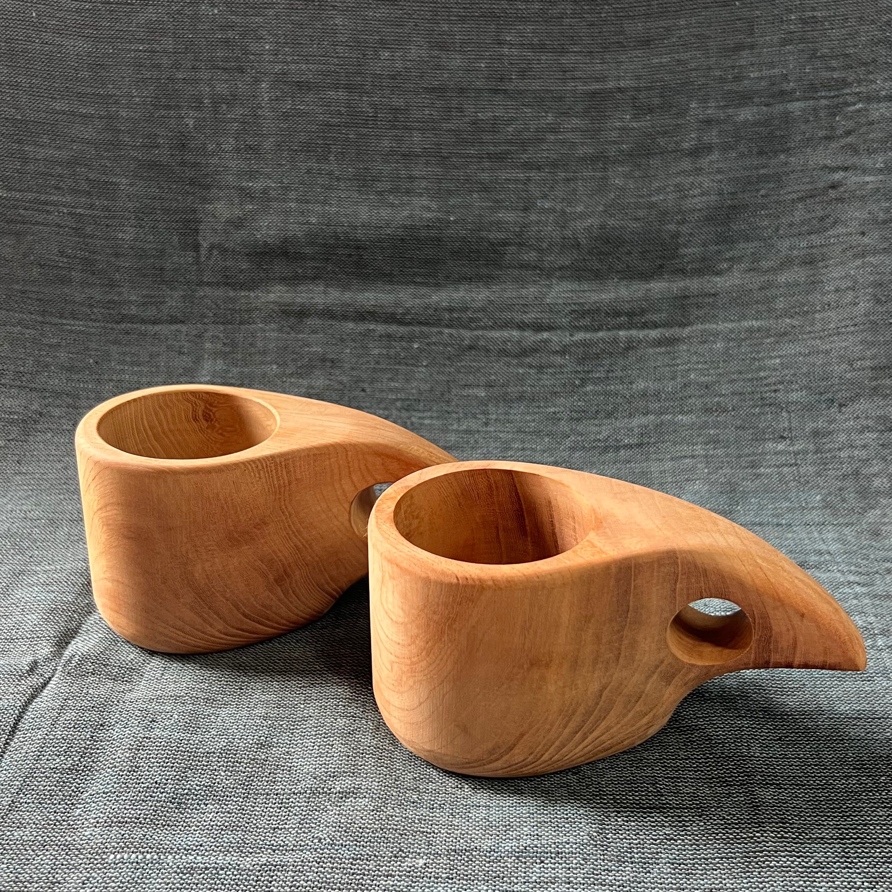1つの欅材から削り出した2つのククサ。ペアでの販売となります。 お好みでサンドペーパー等で仕上げ、付属の蜜蝋を塗り込んで完成となります。蜜蝋が木材に入り込み光沢が広がる感動を味わうことが出来ます。