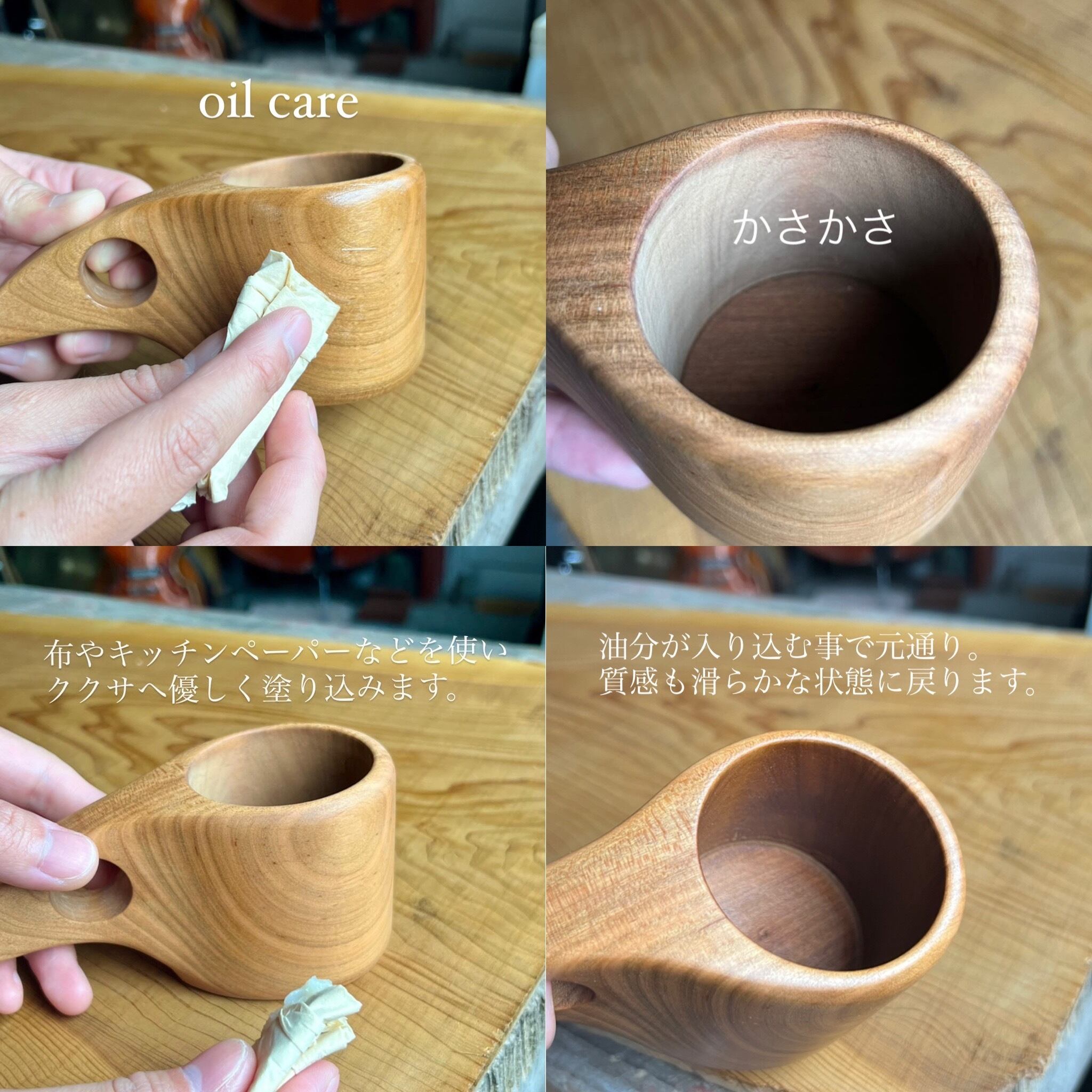 乾燥すると光沢が失われザラつきが出ますが、蜜蝋(クルミオイルや市販の“あまに油”“えごま油”でも代用可能)を塗り込むことで光沢が戻り、使い込むほどに深みのある色合いに育ちます。
